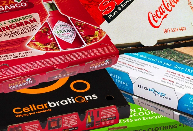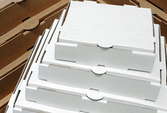 Couponabox is available in all standard pizza box sizes (7”-28”/ 18cm-72cm), in both brown kraft and white paper and in both E flute and B flute. Custom Couponabox designs are also available to order. Size and flute will determine container quantities.