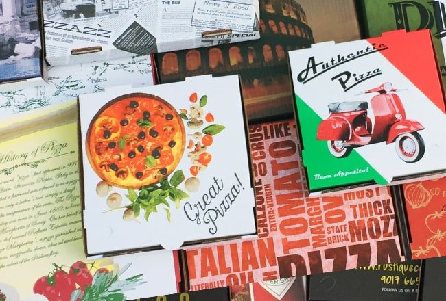 We provide 20ft and 40ft container FOB shipping worldwide. Our pizza boxes are flat packed in bundles of 50 and protected in high grade quality shrink wrap. Palletising is also available. We are happy to mix box sizes and different prints within each container.